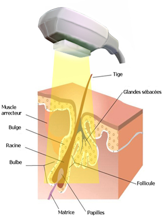 Mise sur le marché en 1996 sous le nom d’IPL (Intense Pulsed Light) le l.a.s.e.r de nos appareils dernière génération permet de produire des impulsions calibrées de light intense à large spectre lumineux. L’énergie est absorbée par le mélanine du poil(ce qui donne la couleur aux poils).Seuls les poils blancs ne réagissent donc pas à cette lumière.